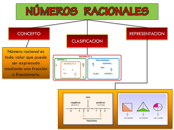 El siguiente mapa conceptual muestra de forma clara el concepto de los numeros racionales, su clasificacion y su manera de representacion.